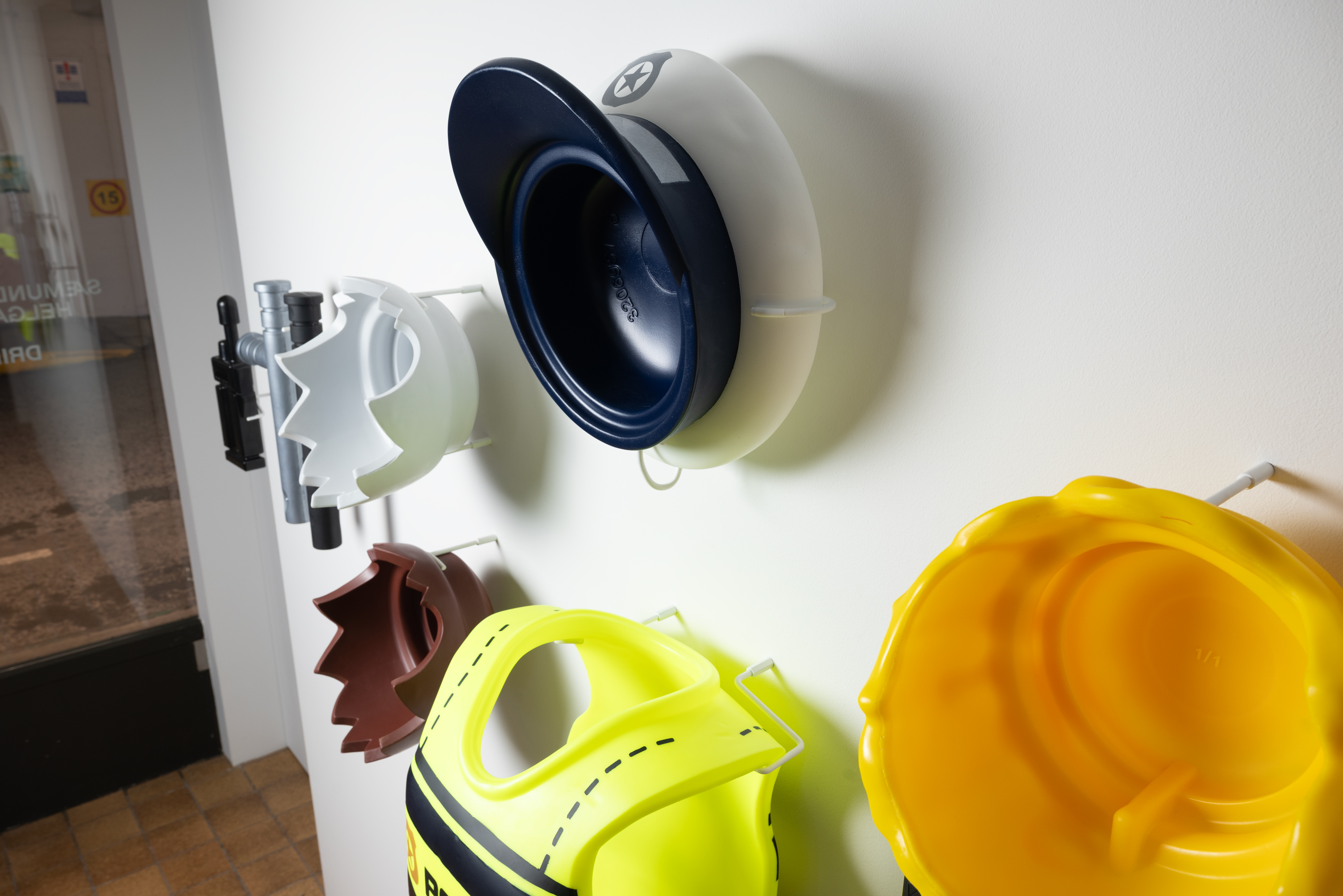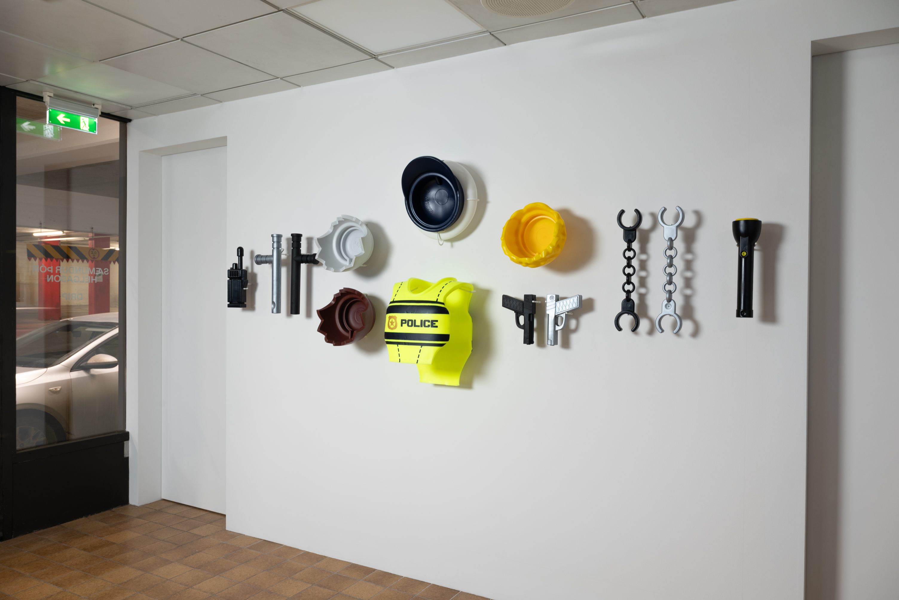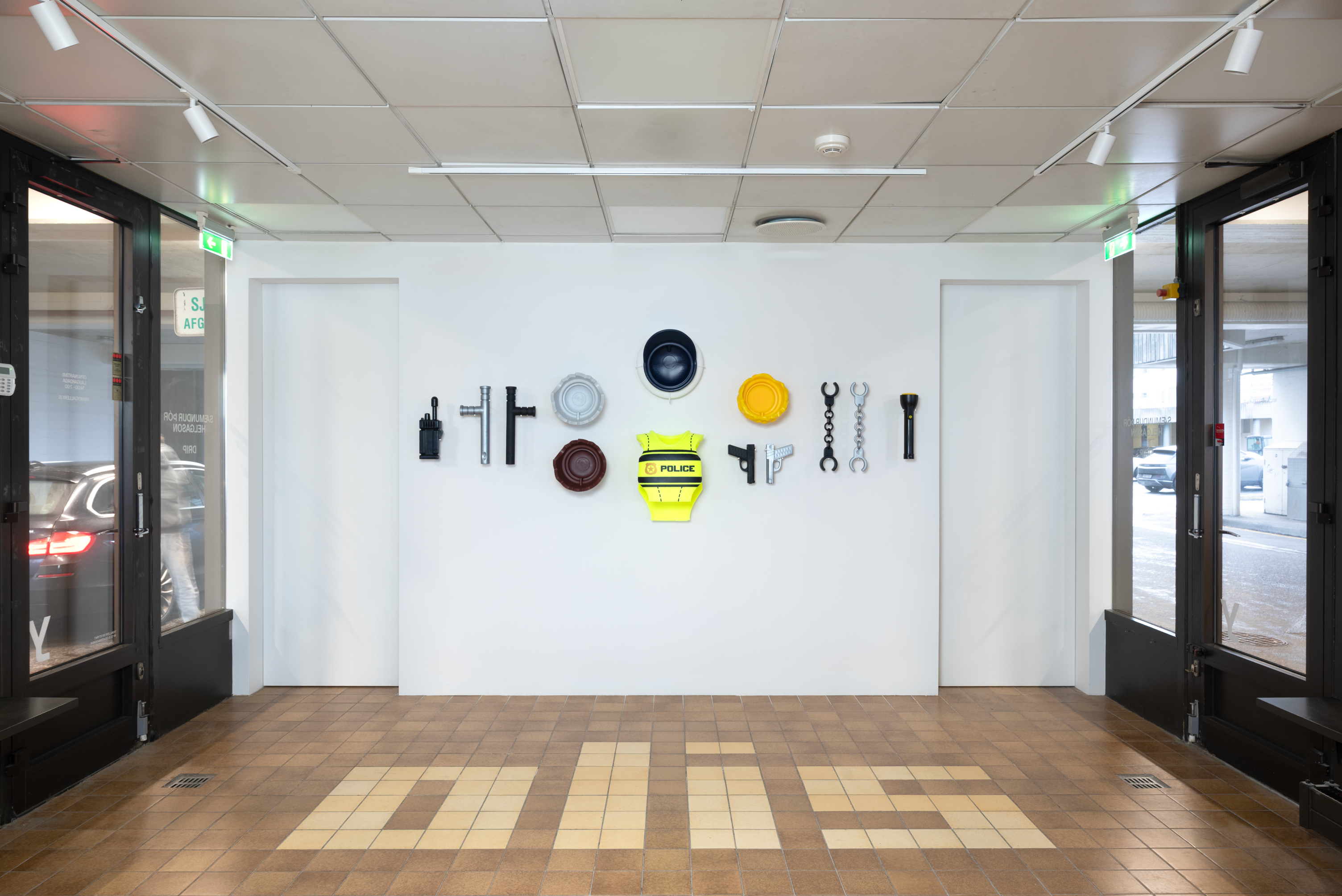 As a reference to the workings of the free market, the exhibition turns to playmobil®*, the heavily patented children's toy. The exhibition features sculptures that are accurate, scaled-up replicas of playmobil accessories including handcuffs, interchangeable hairstyles, a police hat, and a vest. As exact replicas of the original playmobil accessories, the sculptures bear the signs of the injection molding technology used in the mass production of the items, such as ejection and injection marks. The exhibition showcases the artist's approach to product design as social sculpture, where he plays with the societal norms and stereotypes that playmobil reproduces,in order to examine the aesthetics of authority.